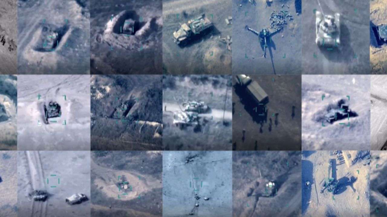 The Azerbaijani Ministry of Defense broadcasted scenes of the destruction of a large number of Armenian military vehicles, Artillery and equipment by the Turkish-made Bayraktar UAVs, while the scenes also clearly show the fall of a large number of dead and wounded soldiers among the Armenian army.