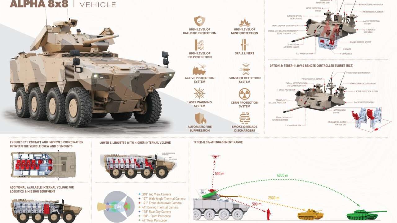 “The new generation PARS ALPHA 8x8 comprises the integration of advanced weaponry. TEBER-II 30/40 remote-controlled turret (RCT) is fitted with 30mm dual feed automatic cannon. The 30mm cannon can be replaced with a 40mm barrel, by only changing the recoil spring and forward feeder. This convertible weapon of choice enables the user to upgrade its firepower with minimum effort, when and wherever required. A 7.62mm chain gun or MAG machine gun can be coaxially mounted aligned with the main gun.