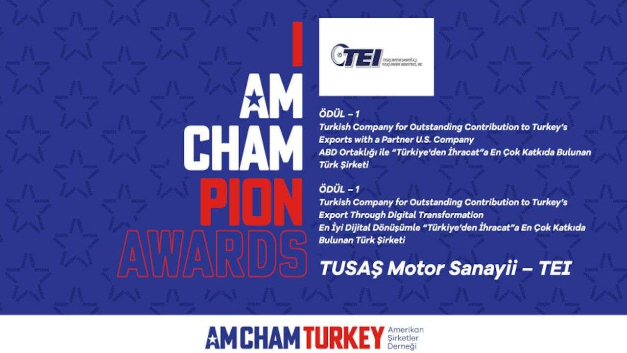 In a post shared by TUSAS Engine Industries (TEI) on twitter the company announced that it has received two awards named 'Turkish company for outstanding contribution to Turkey's exports with a partner U.S. company' and 'Turkish company for outstanding contribution to Turkey's exports through digital transformation' at the çI AmChampion Awards' organized by American Business Forum (AmCham Turkey / ABFT).