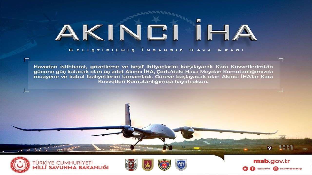 The Turkish Ministry of National Defense (MSB) announced that three Akıncı UAVs were delivered to the Land Forces Command.